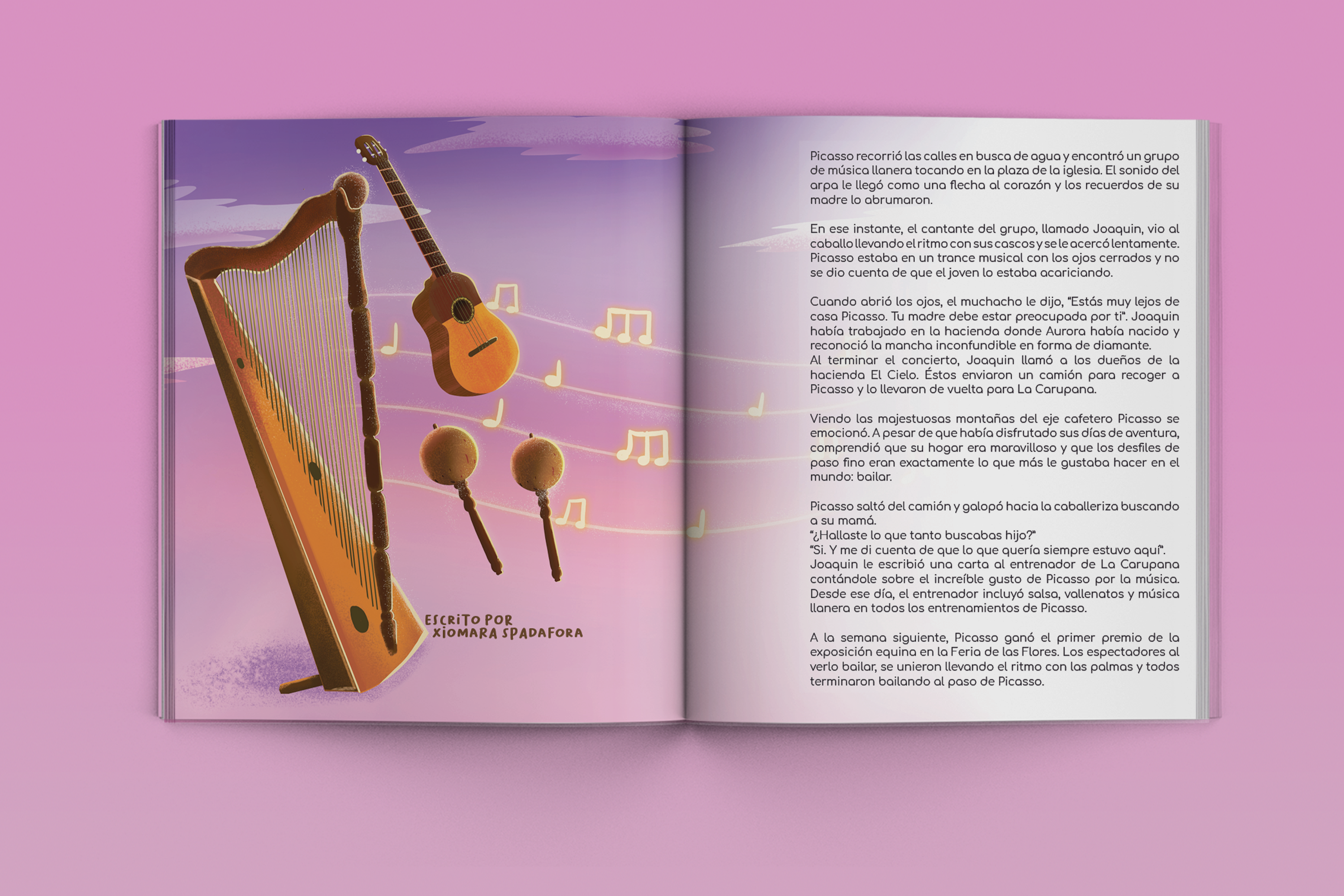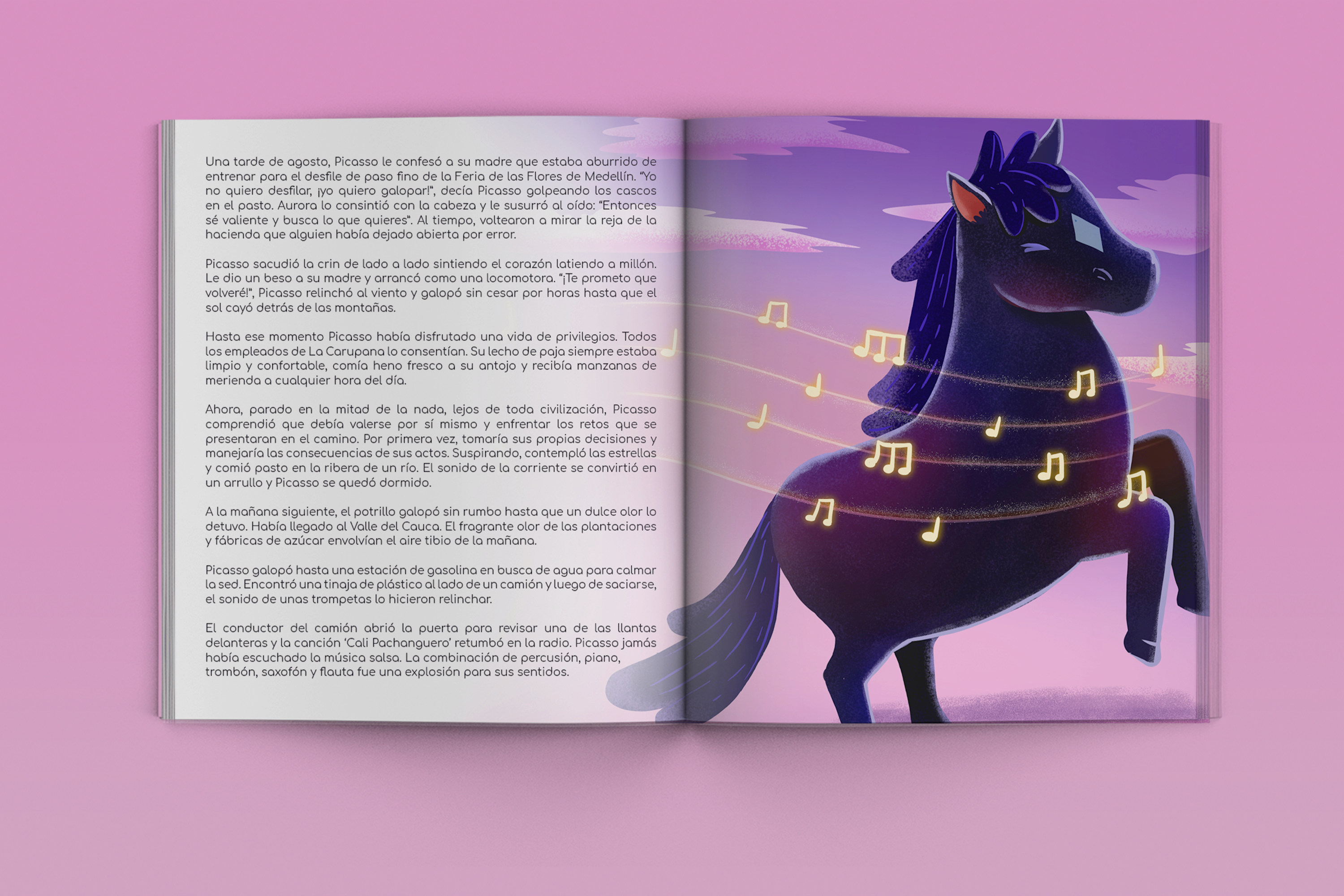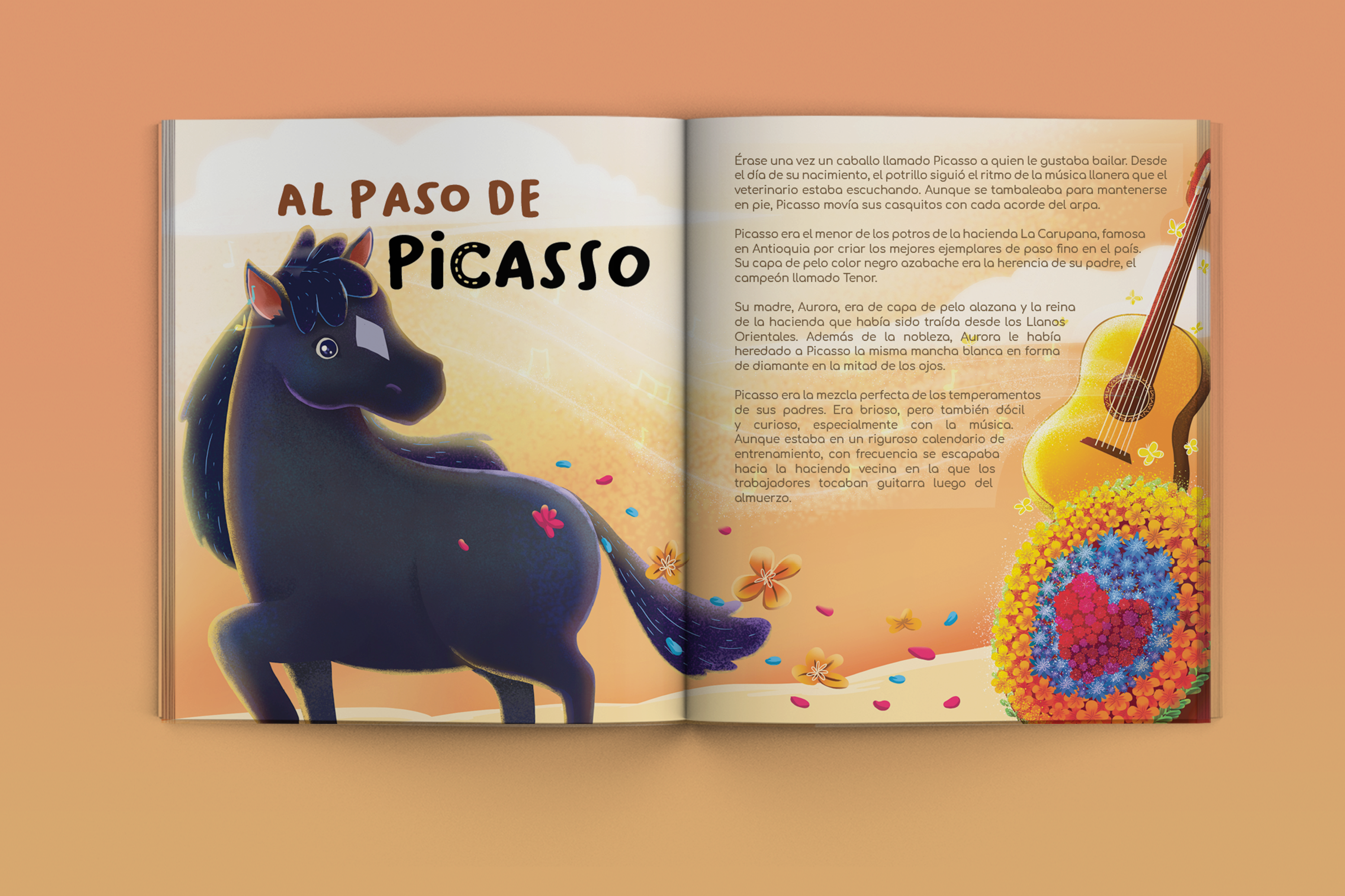 Érase una vez un caballo llamado Picasso a quien le gustaba bailar. Desde el día de su nacimiento, el potrillo siguió el ritmo de la música llanera que el veterinario estaba escuchando. Aunque se tambaleaba para mantenerse en pie, Picasso movía sus casquitos con cada acorde del arpa.